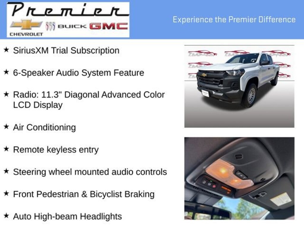 Summit White 2025 Chevrolet Colorado Work Truck RWD 8-Speed Automatic 2.7L I4 Turbocharged DOHC 16V LEV3-ULEV50 310hp 6-Speaker Audio System Feature, Air Conditioning, Apple CarPlay/Android Auto, Auto High-beam Headlights, Following Distance Indicator, Forward Collision Alert, Front Pedestrian & Bicyclist Braking, Radio: 11.3 Diagonal Advanced Color LCD Display, Remote keyless entry, SiriusXM Trial Subscription, Steering Wheel Mounted Audio Controls, Steering wheel mounted audio controls, Wheels: 17 x 8 Ultra Silver Metallic Steel, Wireless Phone Projection.