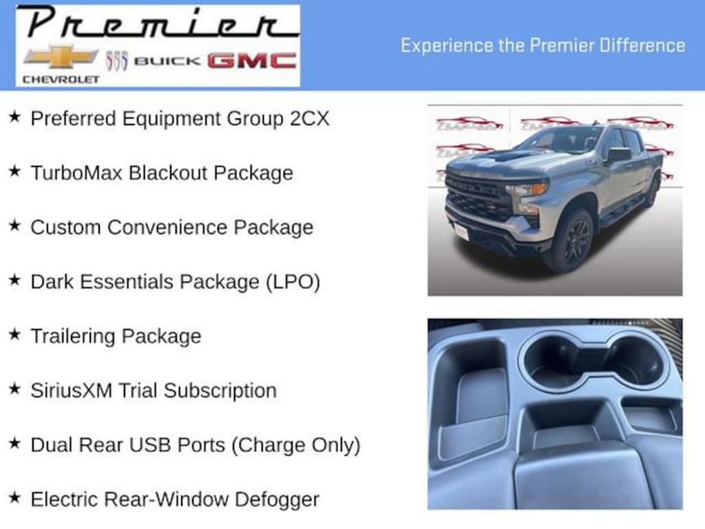 Sterling Gray Metallic 2025 Chevrolet Silverado 1500 Custom Trail Boss 4WD 8-Speed Automatic 2.7L I4 Turbocharged DOHC 16V LEV3-SULEV30 310hp 10-Way Power Driver Seat w/Lumbar, 120-Volt Bed Mounted Power Outlet, 120-Volt Interior Power Outlet, 3.5 Monochromatic Display Driver Info Center, 4 Black Round Assist Steps (LPO), Auto-Locking Rear Differential, Black Chrome Exhaust Tip (LPO), Black Name Plates (LPO), Bluetooth® For Phone, Color-Keyed Carpeting Floor Covering, Custom Convenience Package, Dark Essentials Package (LPO), Deep-Tinted Glass, Dual Rear USB Ports (Charge Only), Electric Rear-Window Defogger, Electronic Cruise Control, EZ Lift Power Lock & Release Tailgate, Front Rubberized Vinyl Floor Mats, HD Rear Vision Camera, Hitch Guidance, LED Cargo Area Lighting, Manual Tilt Wheel Steering Column, OnStar Services Capable, Performance Red Recovery Hooks, Power Front Windows w/Driver Express Up/Down, Power Front Windows w/Passenger Express Down, Power Rear Windows w/Express Down, Preferred Equipment Group 2CX, Rear 60/40 Folding Bench Seat (Folds Up), Rear Rubberized-Vinyl Floor Mats, Remote Keyless Entry, Remote Vehicle Starter System, SiriusXM Trial Subscription, Standard Tailgate, Teen Driver, Theft Deterrent System (Unauthorized Entry), Tire Pressure Monitoring System, Trailering Package, TurboMax Blackout Package, Wheels: 20 x 9 High Gloss Black Painted Alum, Wi-Fi Hot Spot Capable.
