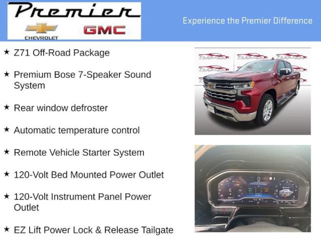 Ask how to SAVE $$$ off of our already GREAT prices!!!New Price! Odometer is 3968 miles below market average! 22/26 City/Highway MPG 2022 Chevrolet Silverado 1500 LTZ Cherry Red Tintcoat 4WD 10-Speed Automatic 3.0L I6 120-Volt Bed Mounted Power Outlet, 120-Volt Instrument Panel Power Outlet, Adaptive Cruise Control, Apple CarPlay/Android Auto, Automatic temperature control, Bed View Camera, Chevytec Spray-On Black Bedliner, Dual Exhaust w/Polished Outlets, EZ Lift Power Lock & Release Tailgate, Front fog lights, Front Frame-Mounted Black Recovery Hooks, Fully automatic headlights, HD Surround Vision, Heated door mirrors, Heated front seats, Heated Steering Wheel, Heavy-Duty Air Filter, Hill Descent Control, Hitch Guidance w/Hitch View, Integrated Trailer Brake Controller, Memory seat, Off-Road Suspension, Power Sunroof, Premium Bose 7-Speaker Sound System, Rain sensing wipers, Rear window defroster, Remote Vehicle Starter System, Steering wheel mounted audio controls, Ventilated front seats, Wi-Fi Hot Spot Capable, Wireless Charging, Z71 Off-Road Package.