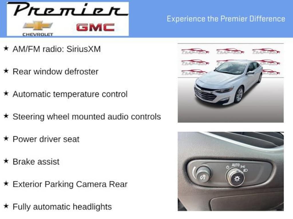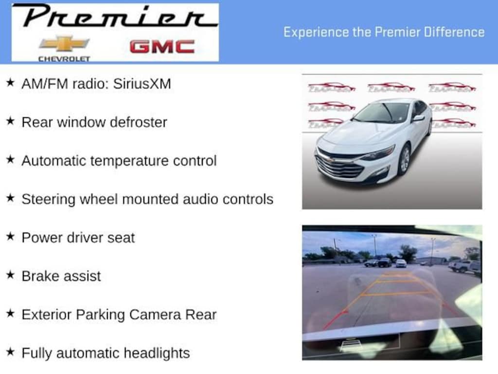 27/35 City/Highway MPG 2023 Chevrolet Malibu LT Summit White 1LT FWD CVT 1.5L DOHC AM/FM radio: SiriusXM, Automatic temperature control, Brake assist, Exterior Parking Camera Rear, Fully automatic headlights, Heated door mirrors, Heated front seats, Power driver seat, Rear window defroster, Steering wheel mounted audio controls, Wireless Apple CarPlay/Android Auto.