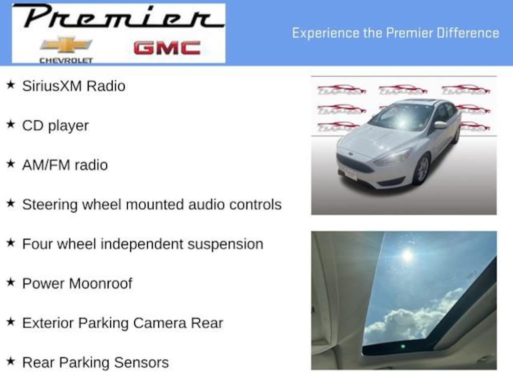 Ask how to SAVE $$$ off of our already GREAT prices!!!Odometer is 13062 miles below market average! 27/40 City/Highway MPG 2016 Ford Focus SE Oxford White FWD Automatic 2.0L 4-Cylinder DGI Flex Fuel DOHC AM/FM radio, CD player, Exterior Parking Camera Rear, Four wheel independent suspension, Fully automatic headlights, Power Moonroof, Rear Parking Sensors, SiriusXM Radio, Steering wheel mounted audio controls.Awards:* 2016 KBB.com Brand Image AwardsReviews:* Balanced ride and handling; quiet interior; attractive interior; abundant list of upscale and high-tech options. Source: Edmunds