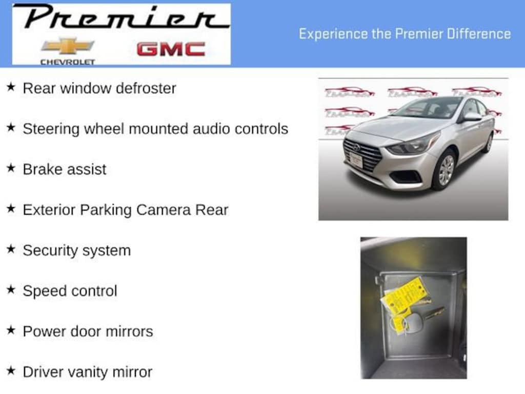 Ask how to SAVE $$$ off of our already GREAT prices!!!Odometer is 1685 miles below market average! 33/41 City/Highway MPG 2021 Hyundai Accent SE Olympus Silver Metallic FWD CVT 1.6L DOHC Brake assist, Driver vanity mirror, Exterior Parking Camera Rear, Outside temperature display, Passenger vanity mirror, Power door mirrors, Rear window defroster, Security system, Speed control, Steering wheel mounted audio controls.